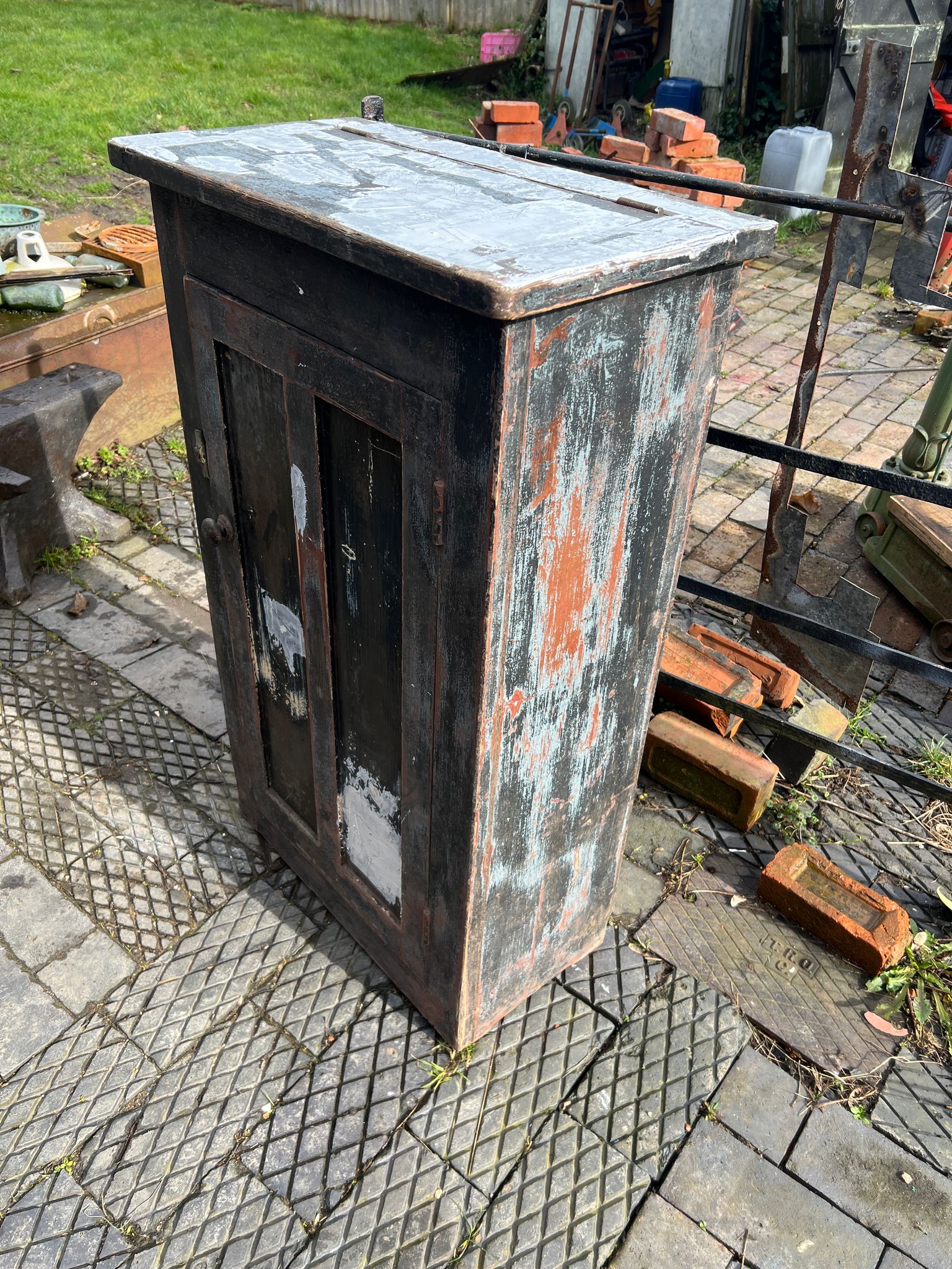 As the rain had stopped it was possible to get the oil lamp cupboard out from Taylors office for a rub down and filling of damaged areas, it was then moved to the workshop to keep it dry and out of the publics eye until it is finished.